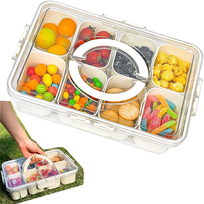 Divided Snack Box, 8 Compartments Portable Serving Tray with Lid and Handle, Clear Snack Platter Organizer for Fruits, Snacks, Nuts, Ideal for Party, Travel & Picnics