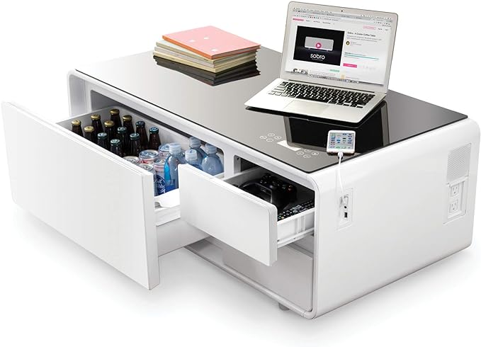 sobro Coffee Table with Built in Fridge, Speakers, Outlets, LED Light, and More - White